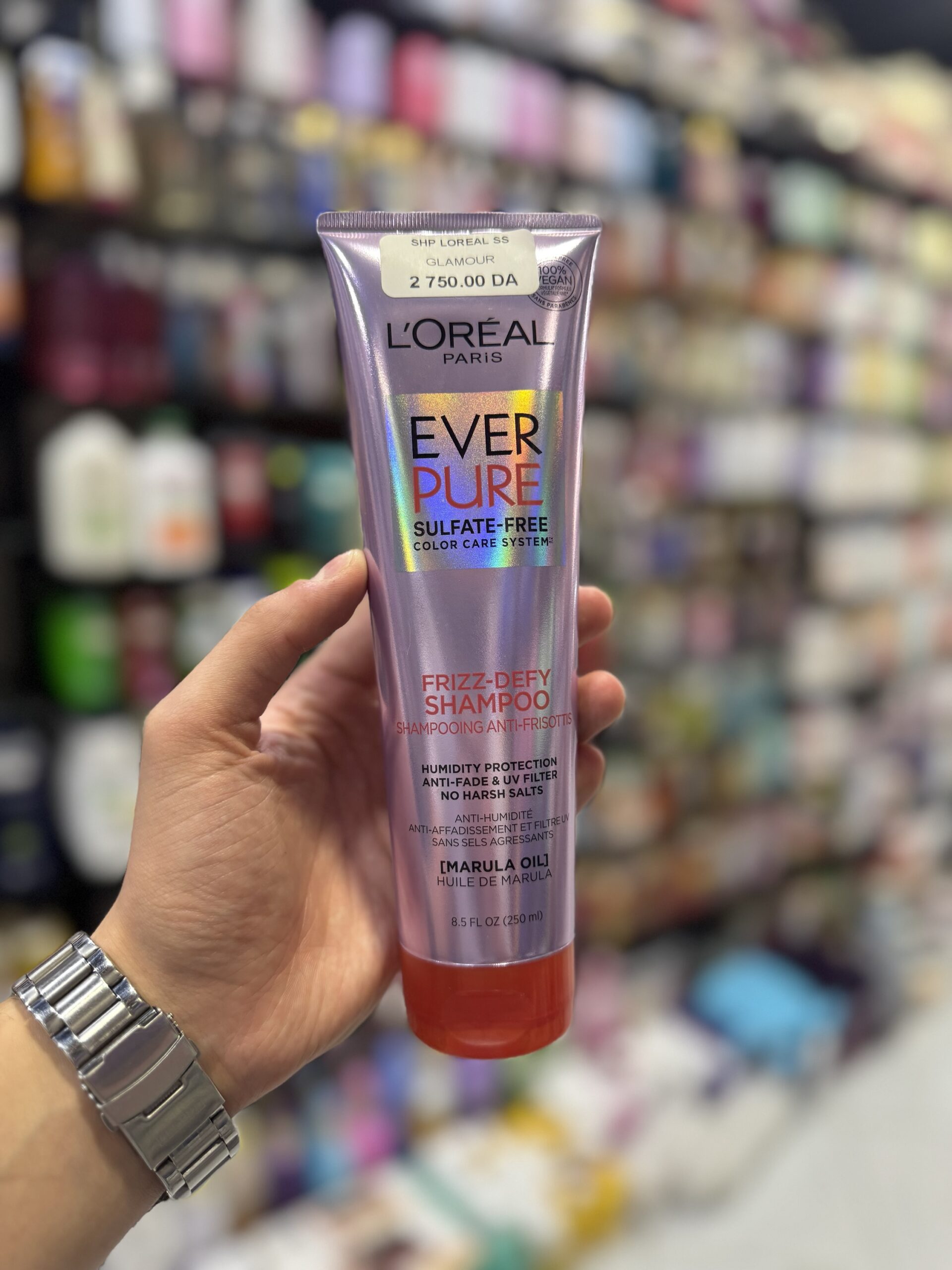 شامبو L’Oréal Paris EverPure Frizz-Defy هو منتج للعناية بالشعر مصمم خصيصًا للتحكم في التجعد وحماية الشعر المصبوغ.تشمل فوائده الرئيسية ما يلي: